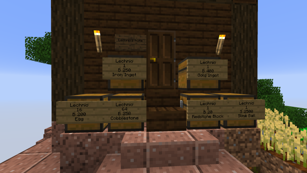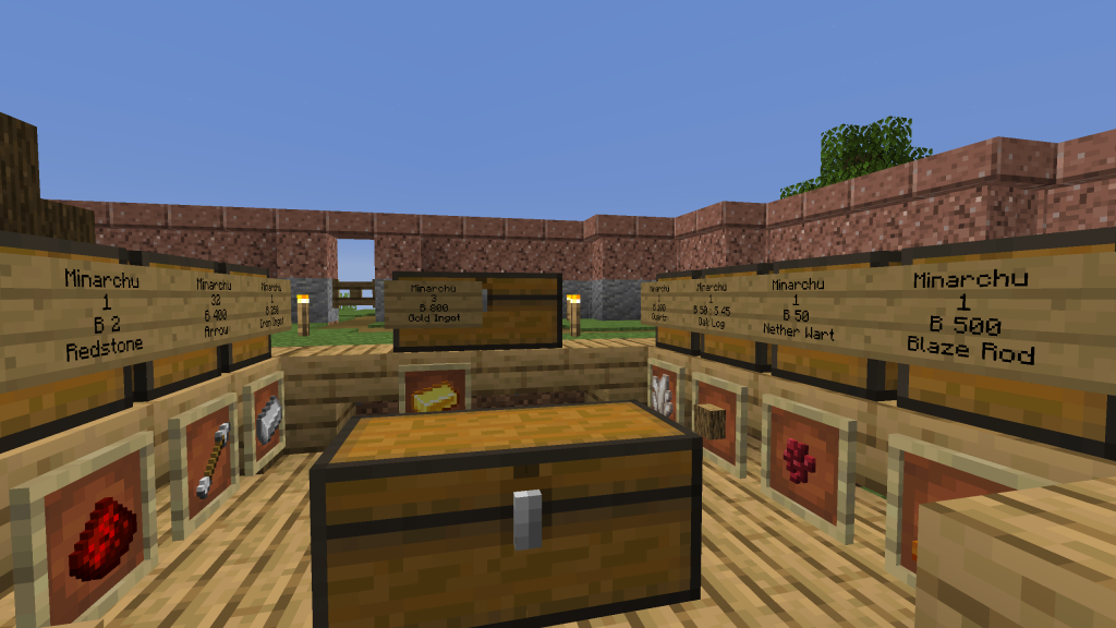 Minarchu has set up a marketplace at his homestead on Ite Island. He sells iron, gold, redstone, quartz, netherwart and arrows. He has also become the first Market Maker of the Frontier as he buys as well as sells oak logs, thus connecting loggers with builders and enabling progress through commerce.