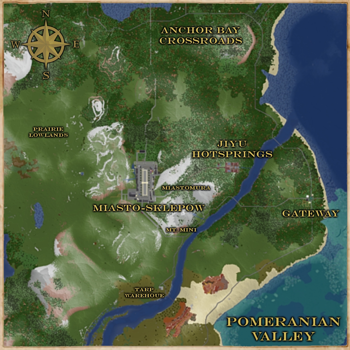 Minarchu first discovered the heart of the Pomeranian Valley on a horseback quest to find solitude... After being swept away by the breathtaking mountain valley, he set up an encampment that would one day become Miasto-Sklepow, a large city hidden between mountains with many historic buildings.